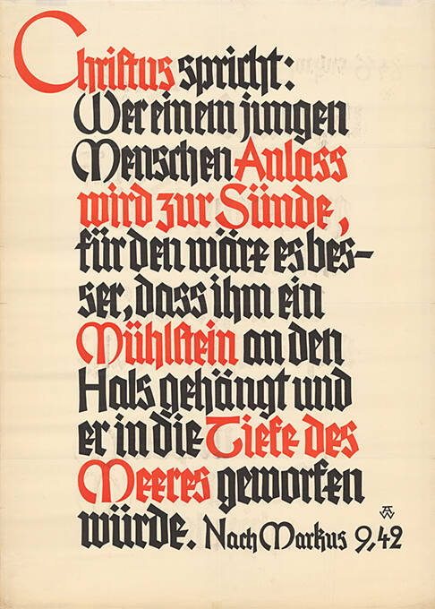 Christus spricht: Wer einem jungen Menschen Anlass wird zur Sünde, für den wäre es besser, dass ihm ein Mühlstein an den Hals gehängt und er in die Tiefe des Meeres geworfen würde. Nach Markus