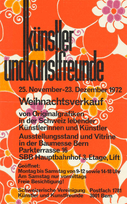 Künstler und Kunstfreunde, Weihnachtsverkauf von Originalgrafiken in der Schweiz lebender Künstlerinnen und Künstler, Ausstellungsstand und Vitrine in der Baumesse Bern